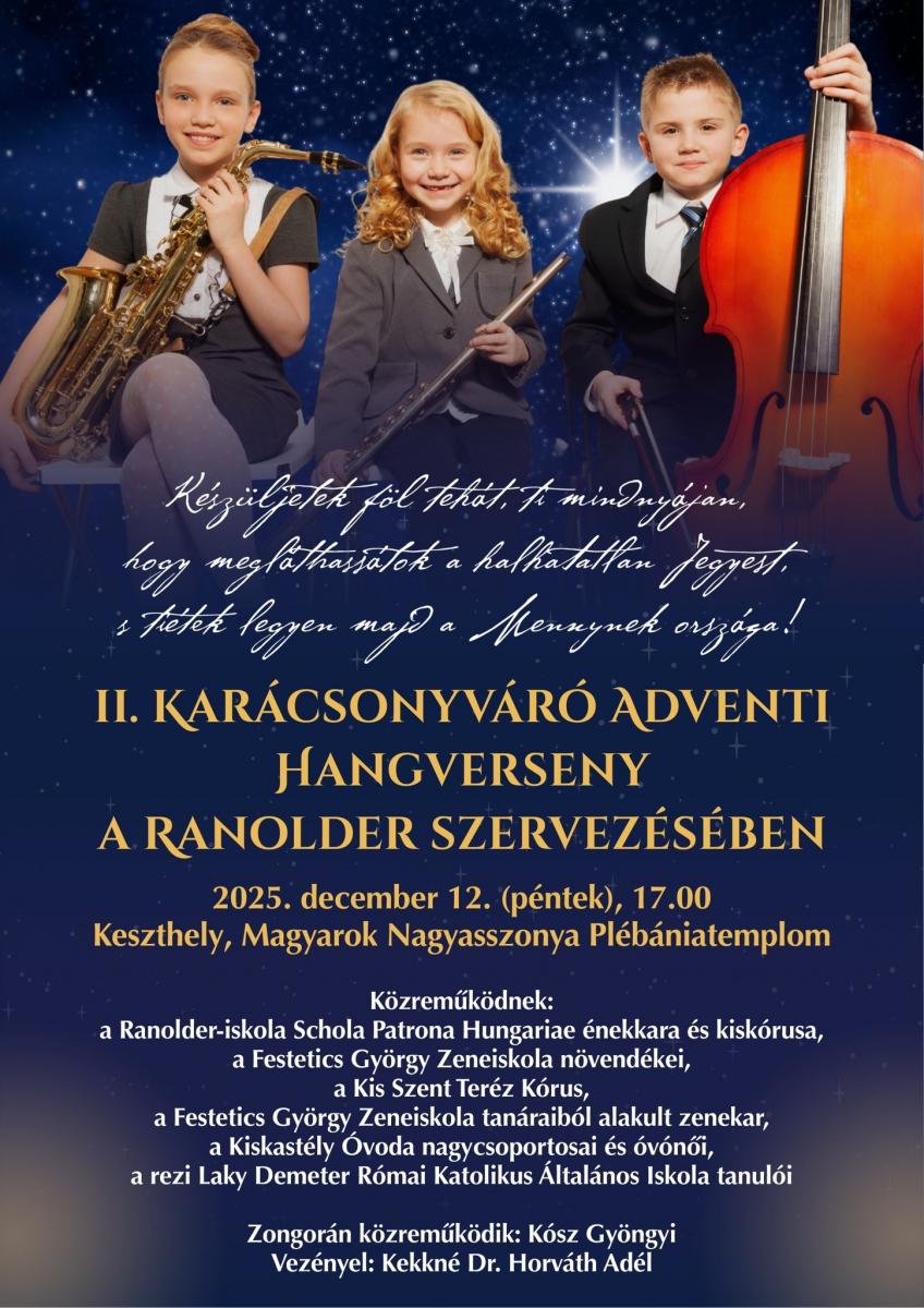 Hírek II. KARÁCSONYVÁRÓ ADVENTI HANGVERSENY A RANOLDER SZERVEZÉSÉBEN 2025. november 27., csütörtök @ 14:59 Megosztás